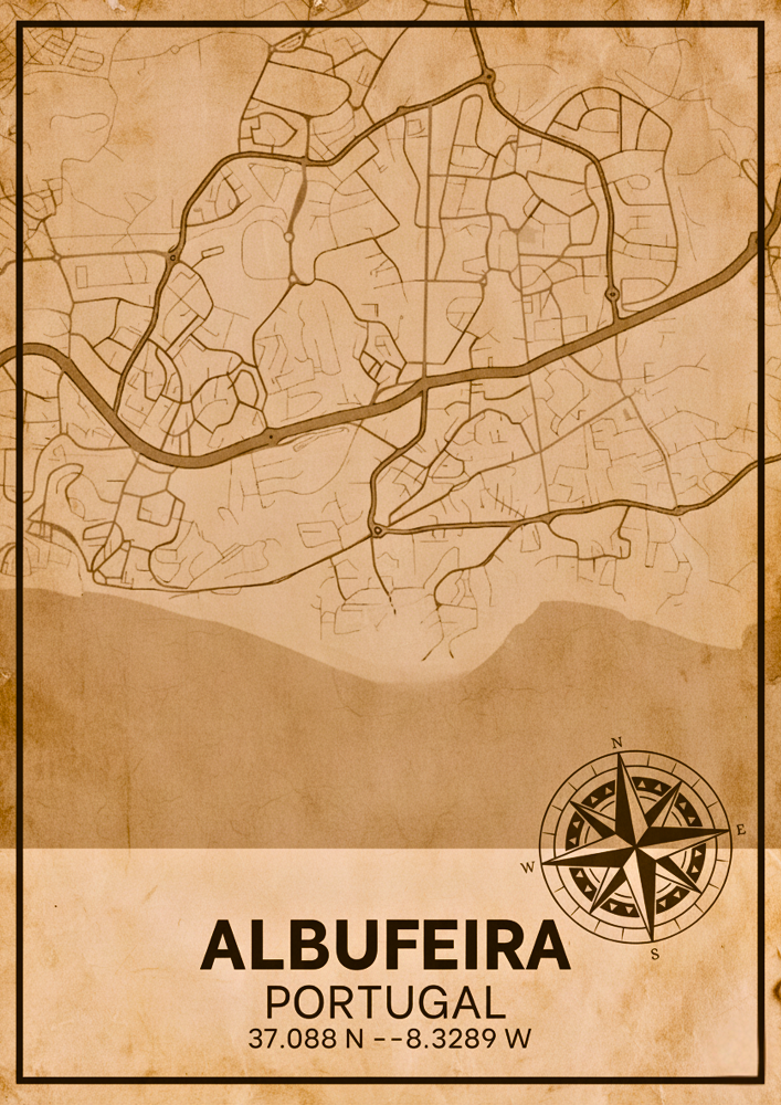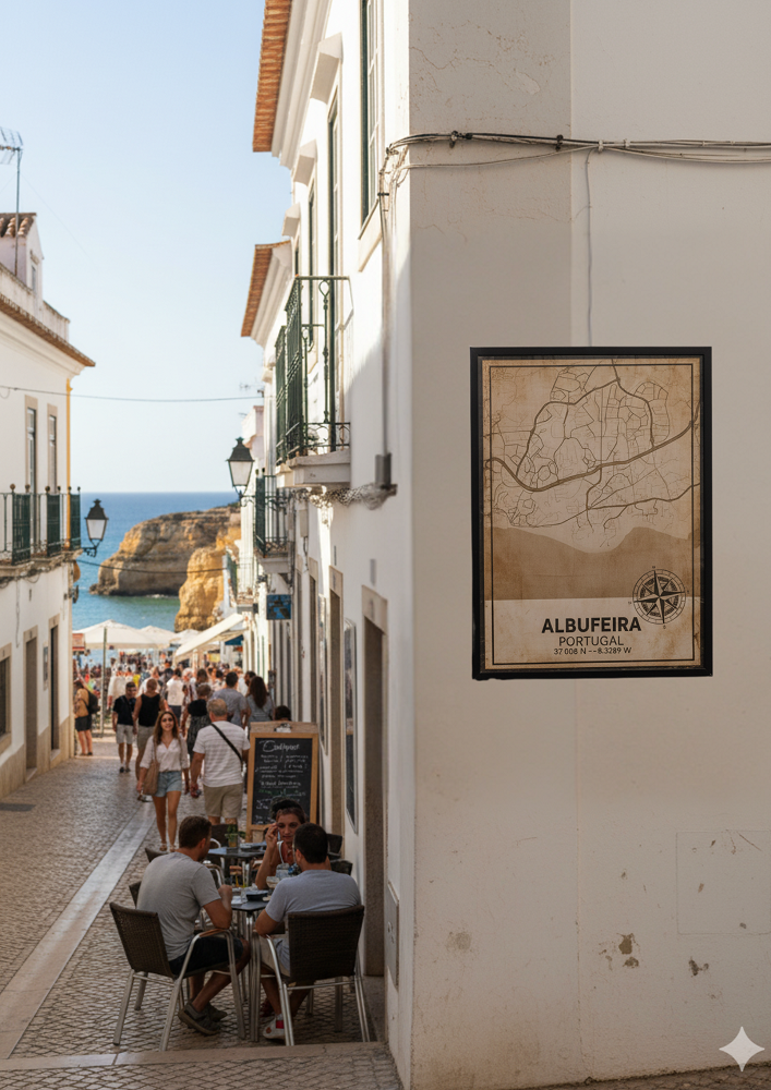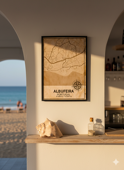 Reviva o espírito do Algarve com este póster em MDF que representa o mapa antigo de Albufeira em tons sépia, num estilo vintage cheio de charme e identidade.